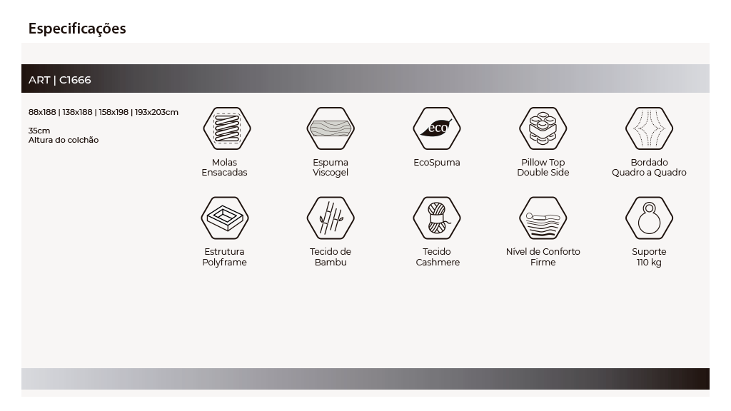 Este colchão conta com a exclusiva EcoSpuma®. É a espuma mais sustentável da Herval. Feita de uma manta de espumas aglomeradas 90% da sua composição é formada por insumos reciclados. A EcoSpuma® é uma espuma de alta densidade, garantindo uma sustentação mais uniforme e menos chance de deformação, o que aumenta a vida útil do seu colchão Herval. A espuma viscogel possui a incrível capacidade de adaptação, moldando-se aos contornos do corpo, garantindo ótima sustentação e diminuindo os pontos de pressão ao dormir. A propriedade do gel auxilia no equilíbrio das temperaturas do corpo, garantindo um sono mais tranquilo e reparador.