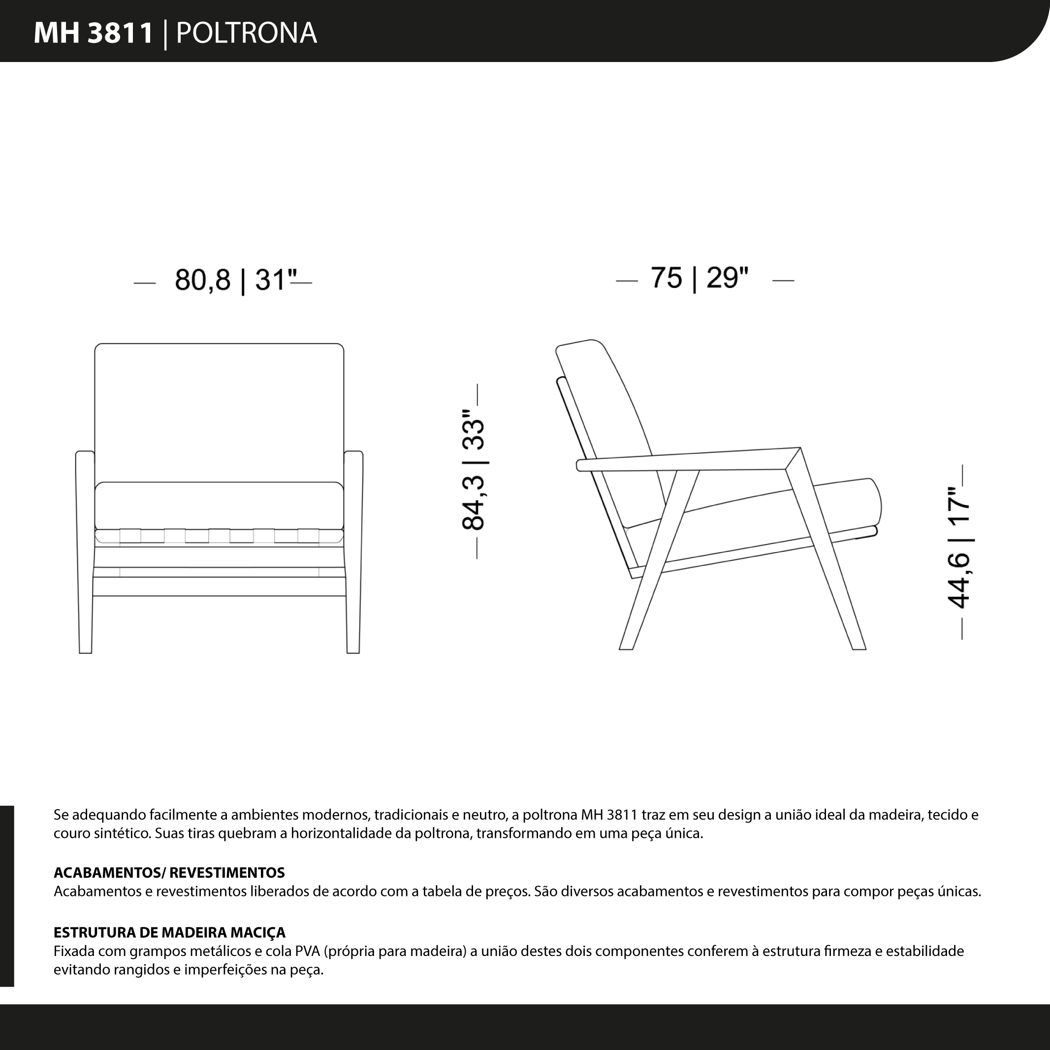 A poltrona MH 3811 é uma verdadeira obra-prima de versatilidade, se adaptando com facilidade a ambientes modernos, tradicionais e neutros. Seu design é a união perfeita de elementos: madeira, tecido e couro sintético, harmonizados de forma magnífica. As tiras presentes na poltrona quebram a horizontalidade, conferindo-lhe um toque único e distinto, tornando-a uma peça verdadeiramente especial. Com a MH 3811, você terá não apenas uma poltrona funcional e confortável, mas também um elemento de destaque e elegância em sua decoração, criando um espaço encantador e acolhedor para relaxar e aproveitar momentos especiais.