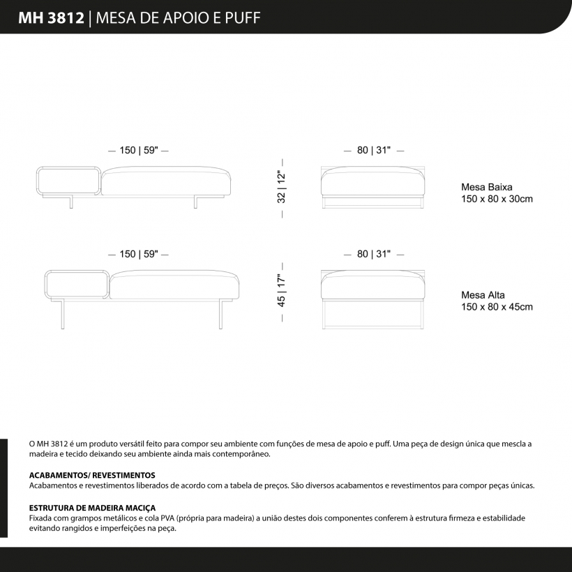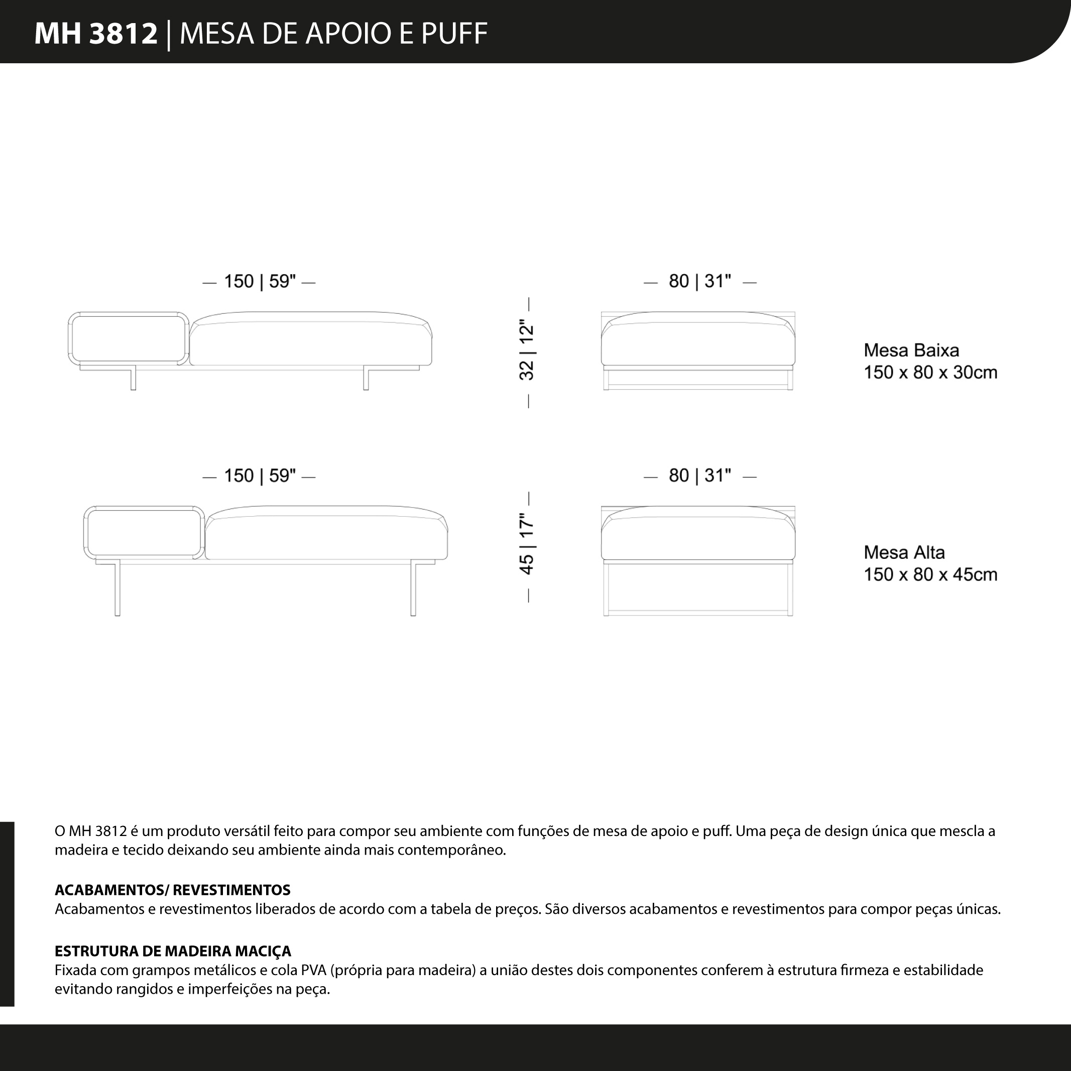 A mesa de centro MH 3812 é um exemplo perfeito de versatilidade e estilo combinados em um único móvel. Com um design moderno e funcional, esta mesa de centro é uma adição elegante a qualquer sala de estar. Uma parte do tampo é coberta por uma almofada macia, proporcionando um espaço aconchegante para descansar os pés ou para acomodar objetos delicados. Essa almofada oferece conforto e suavidade, convidando os usuários a relaxar e desfrutar de momentos de descontração. A outra parte do tampo é feita de chapa laminada, criando uma superfície sólida e durável. Essa área é perfeita para colocar bebidas, livros, revistas ou qualquer outro item que você queira manter ao alcance.