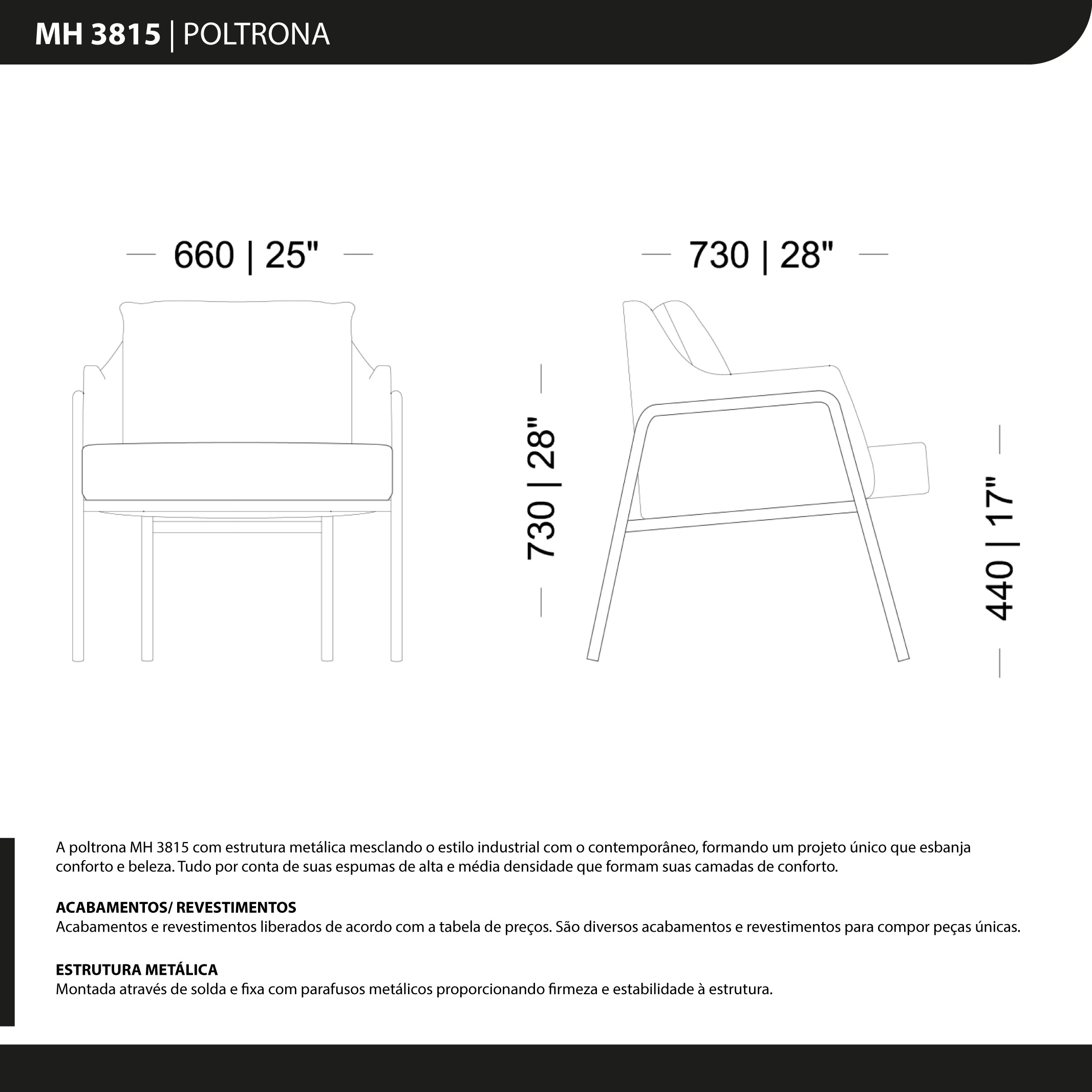 A poltrona MH 3815 com estrutura metálica mesclando o estilo industrial com o contemporâneo, formando um projeto único que esbanja conforto e beleza. Tudo por conta de suas espumas de alta e média densidade que formam suas camadas de conforto.