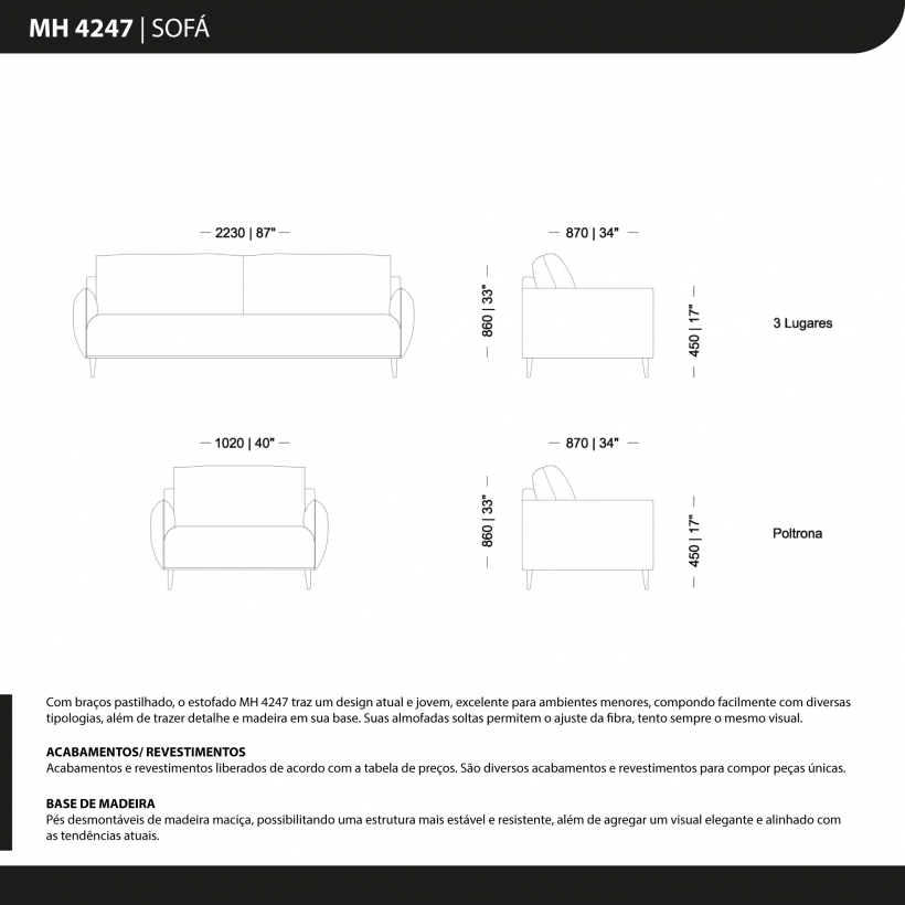 BASE MADEIRA Pés desmontáveis de madeira maciça, possibilitando uma estrutura mais estável e resistente, além de agregar um visual elegante e alinhado com as tendências atuais.