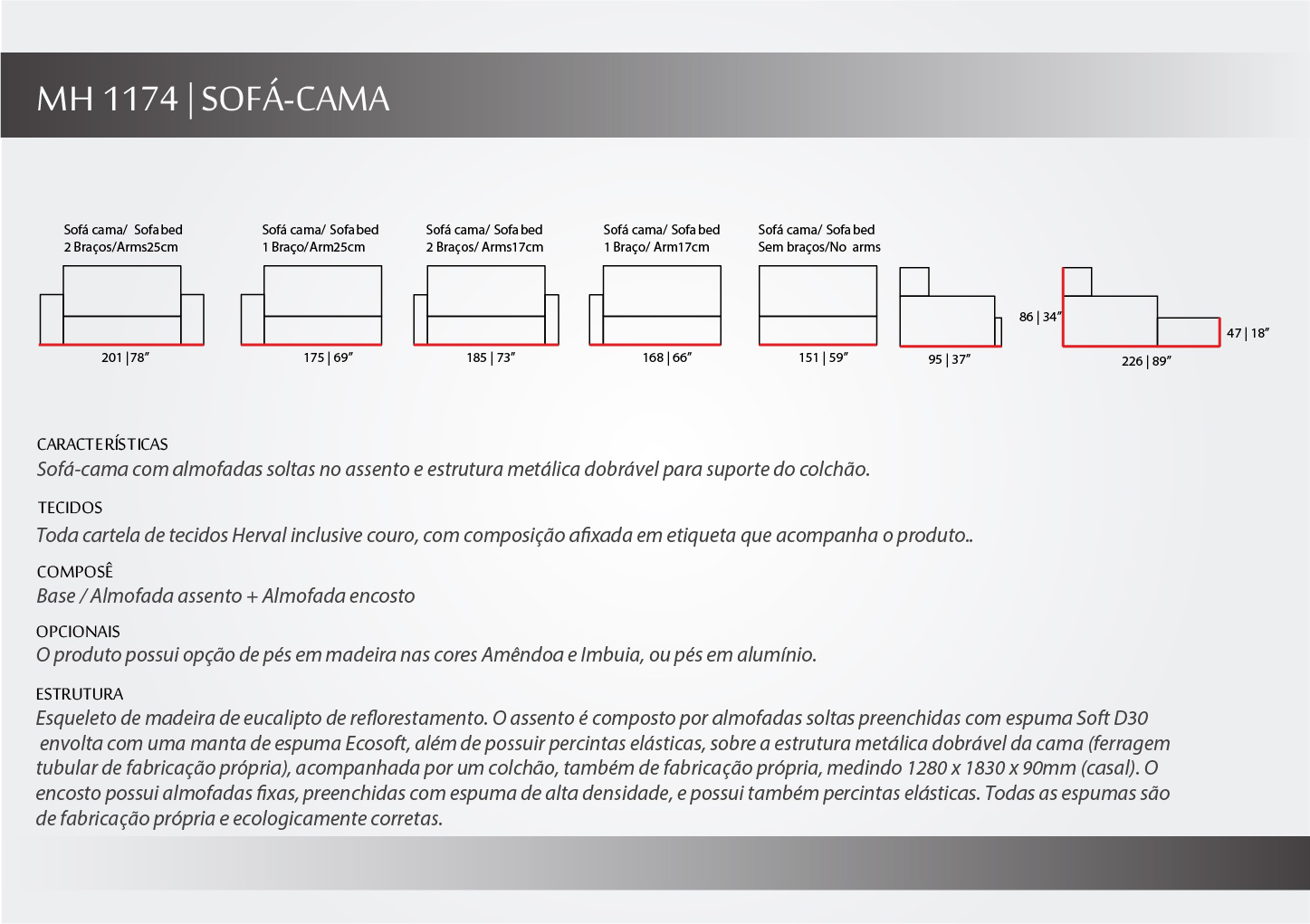 Excelente investimento para quem está procurando praticidade, versatilidade e conforto sem abrir mão de qualidade e elegância, complementando o conforto do MH 1174, o produto acompanha um colchão de casal, onde seu sistema articulável transforma o sofá em uma confortável cama de casal. Além disso, suas almofadas são feitas em espumas de alta densidade, trazendo ainda mais comodidade para você.