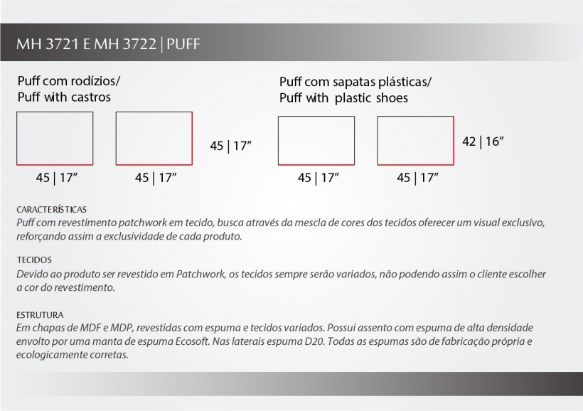 Os puffs com revestimento patchwork em tecido, buscam através da mescla de cores do tecido oferecer produtos com visual exclusivo, portanto oferecem 02 opções de desenho porém sempre em cores distintas, reforçando assim a questão da exclusividade.