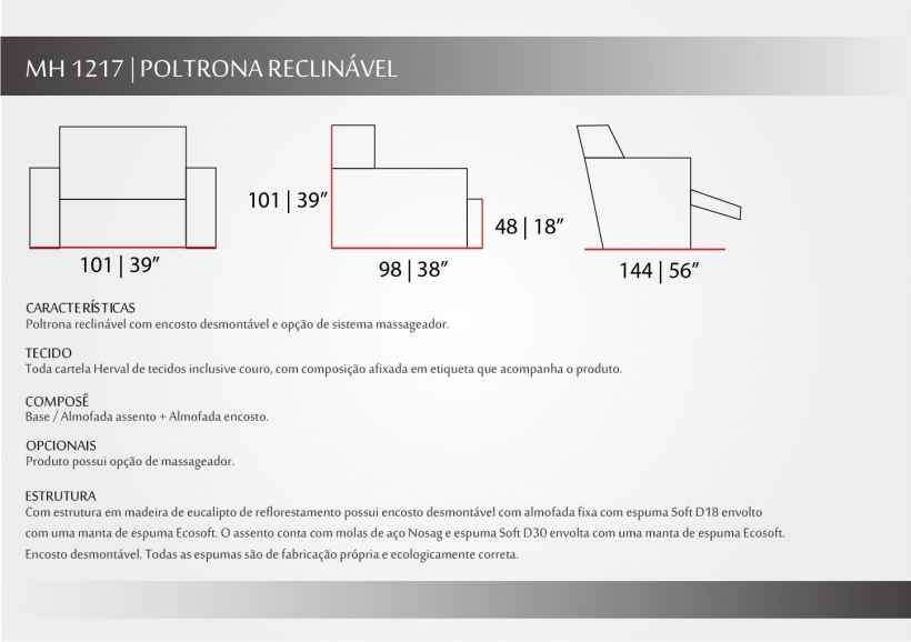 Poltrona reclinável com acionamento manual ou acionamento touch. As espumas do assento e a fibra no encosto empregam nesta poltrona um conforto ímpar, ideal para momentos de relaxamento total. O visual que mistura o clássico com o contemporâneo faz com que esta peça se encaixe perfeitamente em todos os gostos e estilos de ambientes.