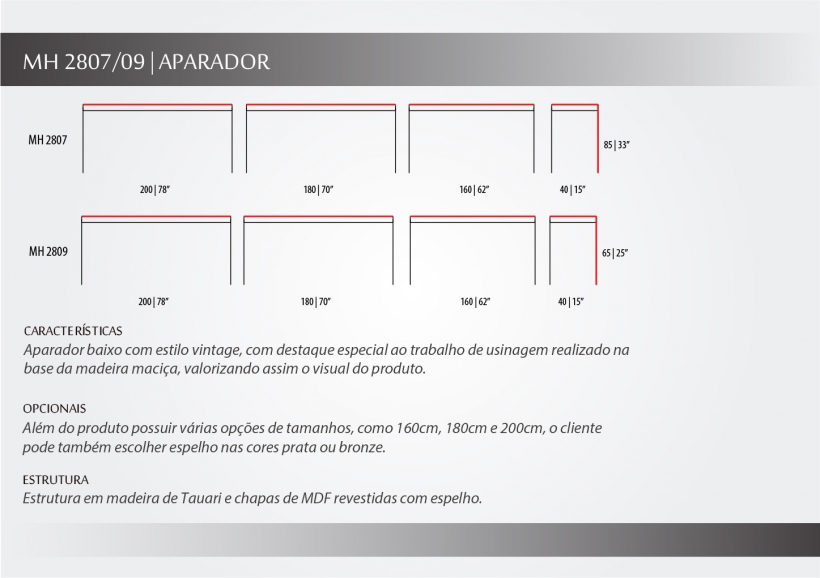 O modelo conta com opção de tampo espelhado ou com lâmina natural de madeira.