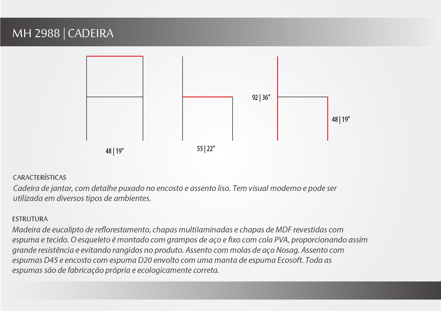 Cadeira de jantar com visual contemporâneo e sofisticado, com detalhe na costura do encosto. As linhas puras e suaves fazem com que esta peça se encaixe perfeitamente em qualquer ambiente. O uso da madeira maciça na estrutura permite plena estabilidade e resistência da cadeira.