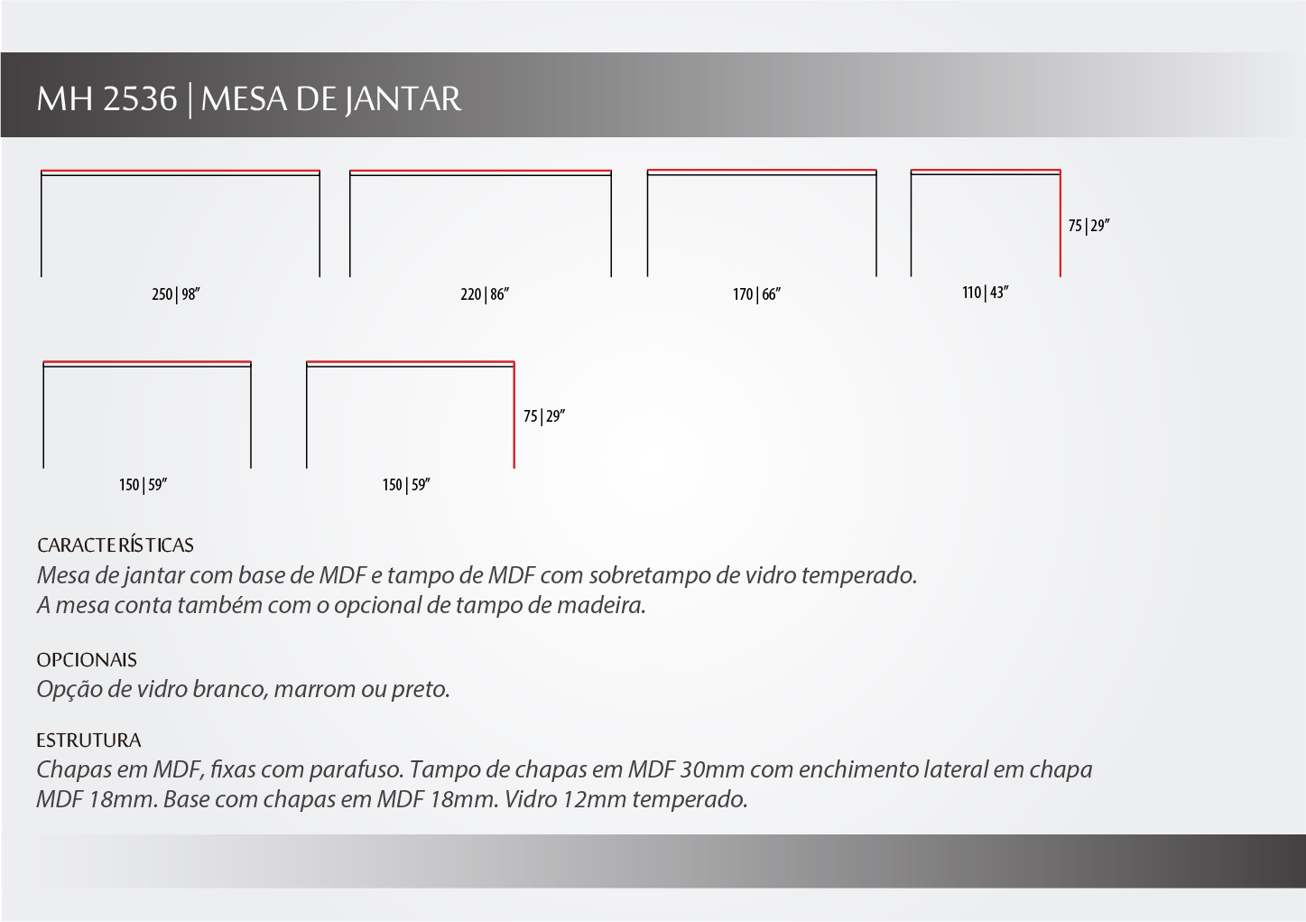 Mesa de jantar com base em estrutura de MDF com formatação contemporânea, trazendo um visual elegante e cheio de personalidade. O sobre tampo de MDF com vidro colado permite melhor limpeza agregando sofisticação à peça. Esta mesa de jantar conta com opção de tampo laminado ou tampo com vidro pintado colado.