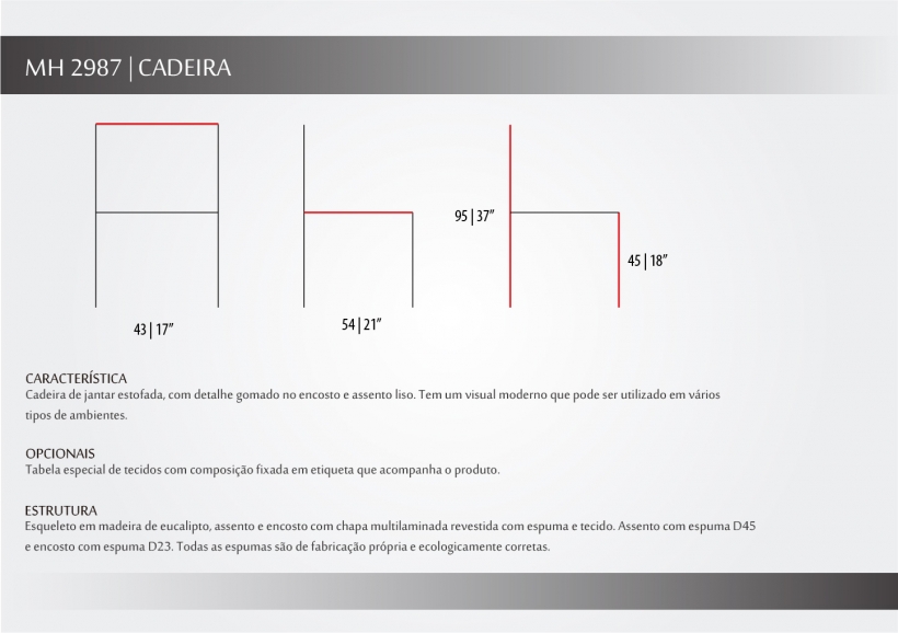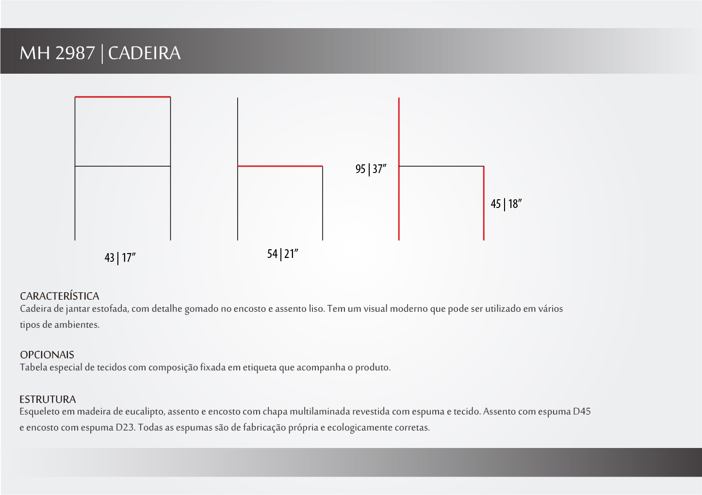 Cadeira de jantar com visual contemporâneo e sofisticado, com detalhe na costura do encosto. As linhas puras e suaves fazem com que esta peça se encaixe perfeitamente em qualquer ambiente. O uso da madeira maciça na estrutura permite plena estabilidade e resistência da cadeira.