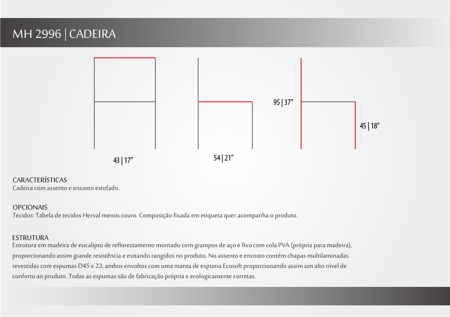 Cadeira de jantar com visual contemporâneo e sofisticado com detalhes nas costuras do encosto. As linhas puras e suaves fazem com que esta peça se encaixe perfeitamente em qualquer ambiente. O uso da madeira maciça na estrutura permite plena estabilidade e resistência da cadeira.