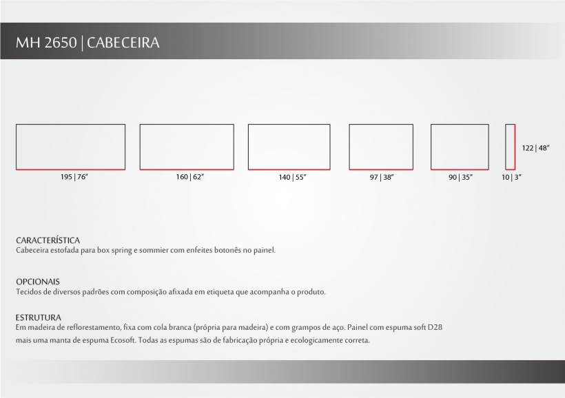 A cabeceira MH 2650 é feita para agregar mais conforto e beleza ao seu dormitório, através do seu sistema de conforto que conta com espuma de media densidade e manta eco soft. Seus detalhes feitos para quebrar sua horizontalidade dão destaque a cabeceira através dos seus botonetes que se localizam em cada ponto que as linhas verticais e horizontais se encontram, criando assim seu design contemporâneo.