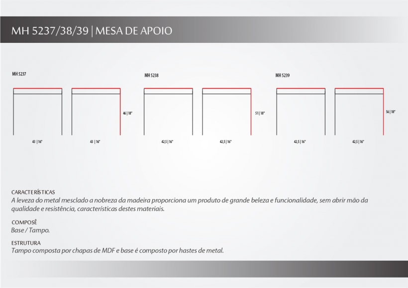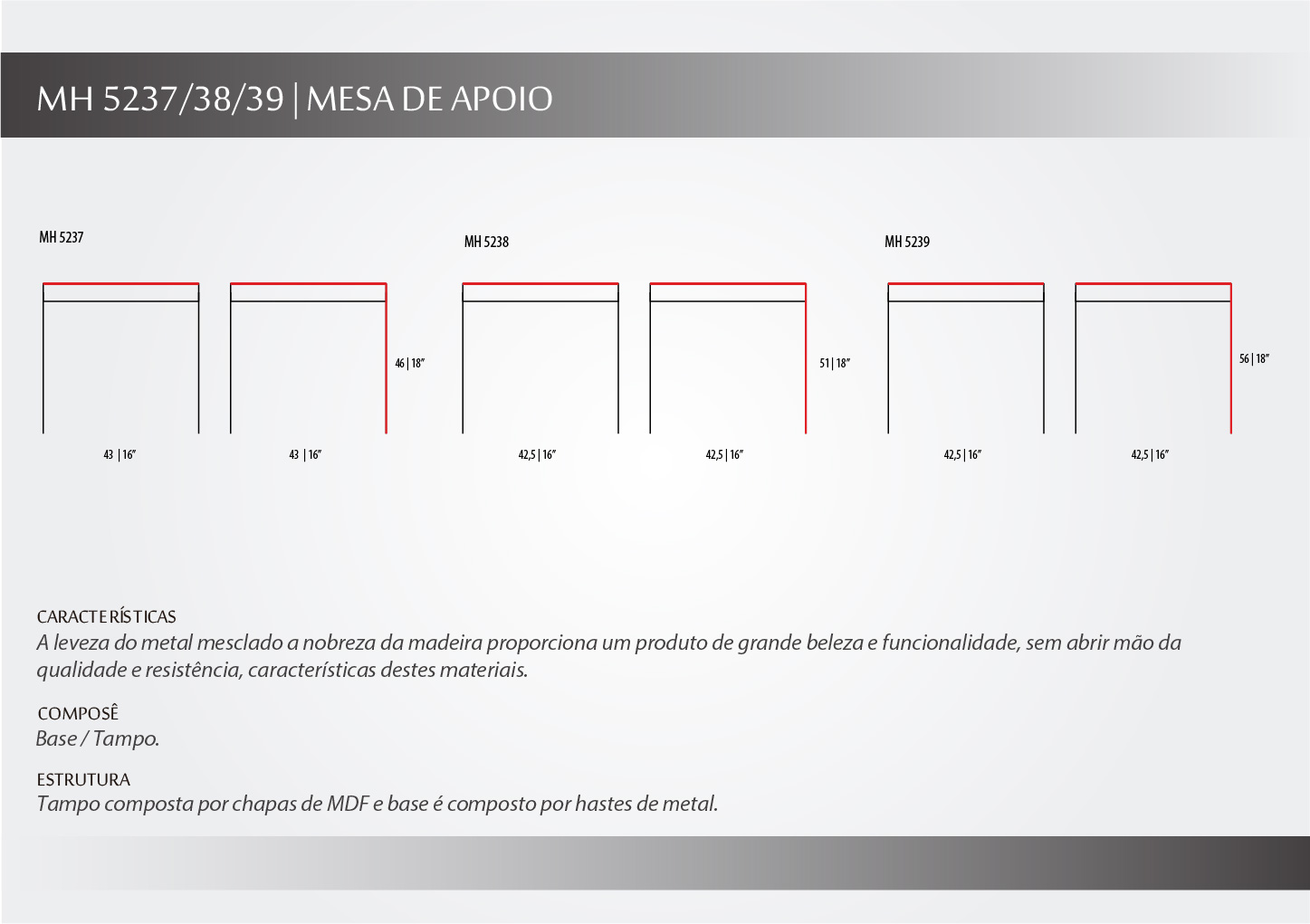 Com estrutura leve e visual contemporâneo, as mesas de apoio MH 5237, MH 5238 e MH 5239 são peças chave na decoração de salas, quartos e home cinema. Perfeitas em qualquer ambiente, a base metálica e o tampo de MDF combinados tornam o design desta peça ideal para todos os tipos de ambientes e decoração. Versáteis, elas são ideais para apoiar revistas, vasos, arranjos e objetos decorativos.