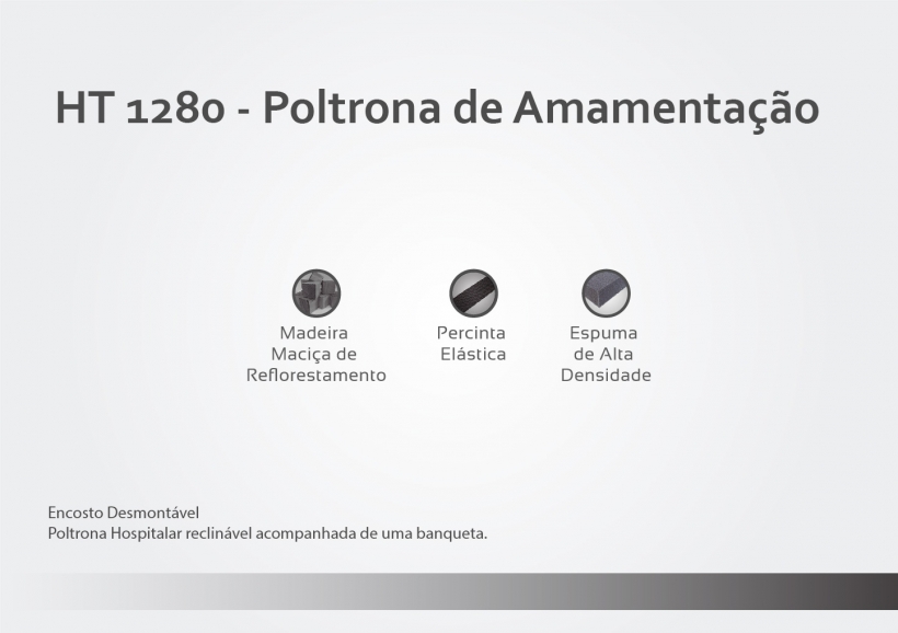 Encosto desmontável, com percintas elásticas. Assento fixo, com percintas elásticas. Encosto e assento com espuma de alta