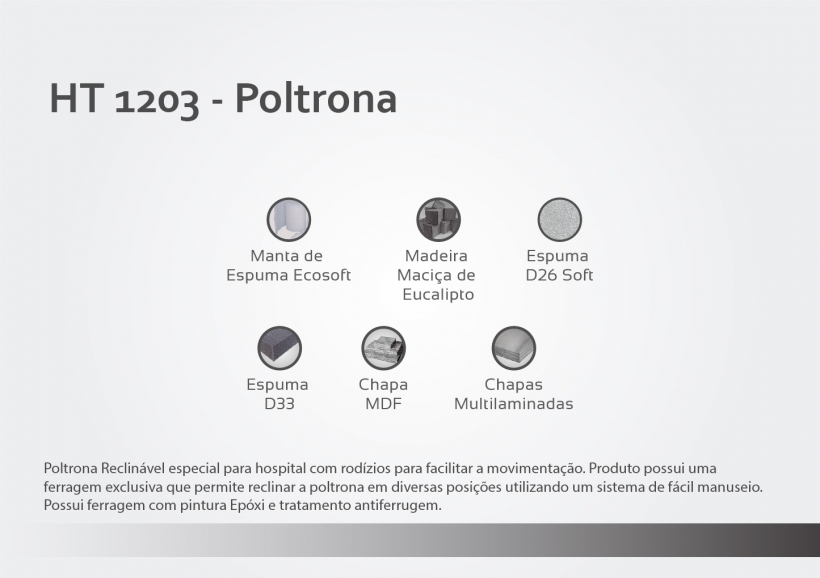 Poltrona Reclinável especial para hospital com rodízios para facilitar a movimentação. Produto possui uma ferragem exclusiva que permite reclinar a poltrona em diversas opções utilizando um sistema de fácil manuseio.