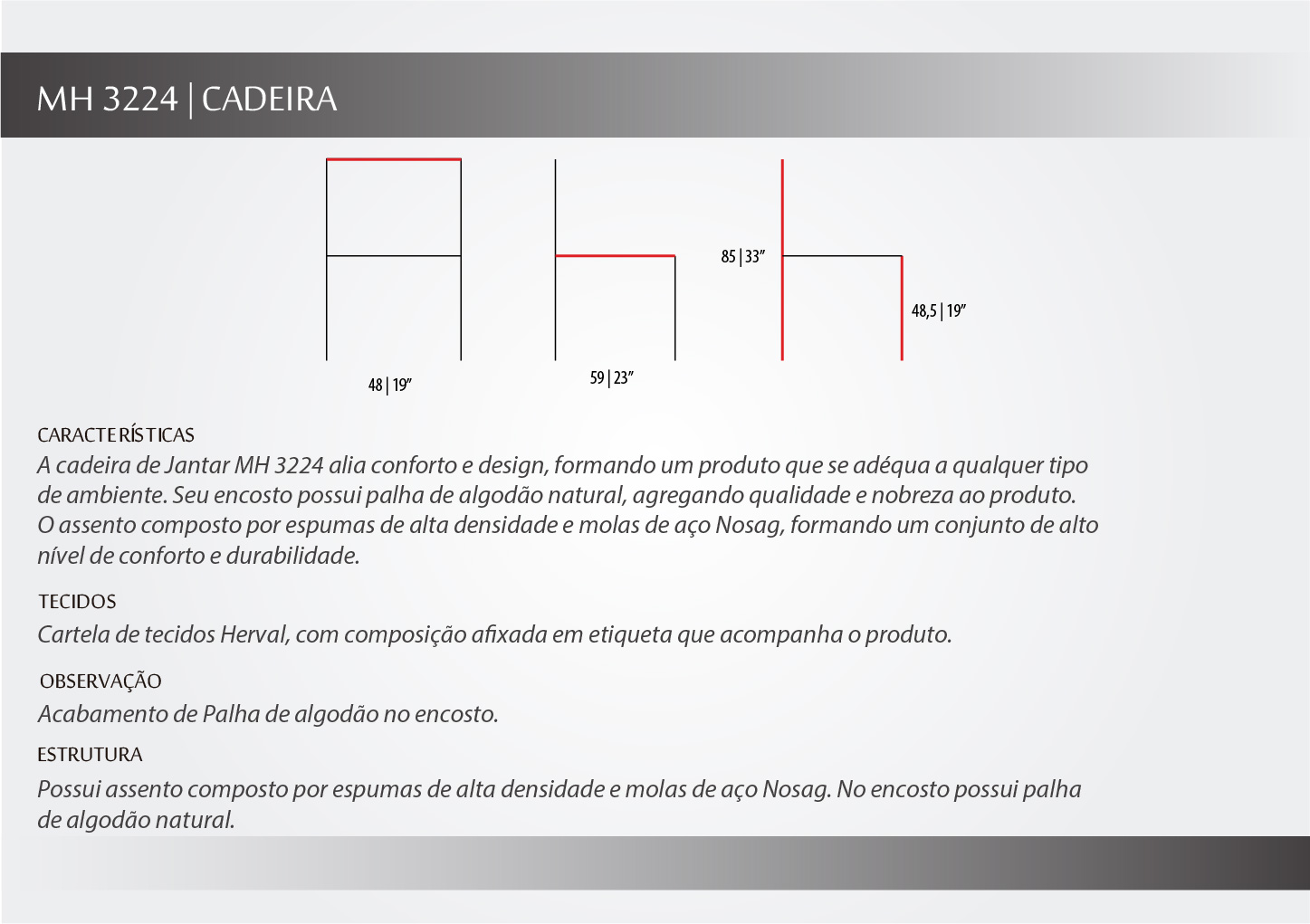 A cadeira de jantar MH 3224 conta com conforto extra. O assento possui molas nosag e o encosto conta com palha natural de algodão, isso unido as espumas de alta qualidade permitem o perfeito conforto do usuário. O visual com formas puras e a palha natural do encosto tornam essa cadeira perfeita para todos os tipo de ambiente.