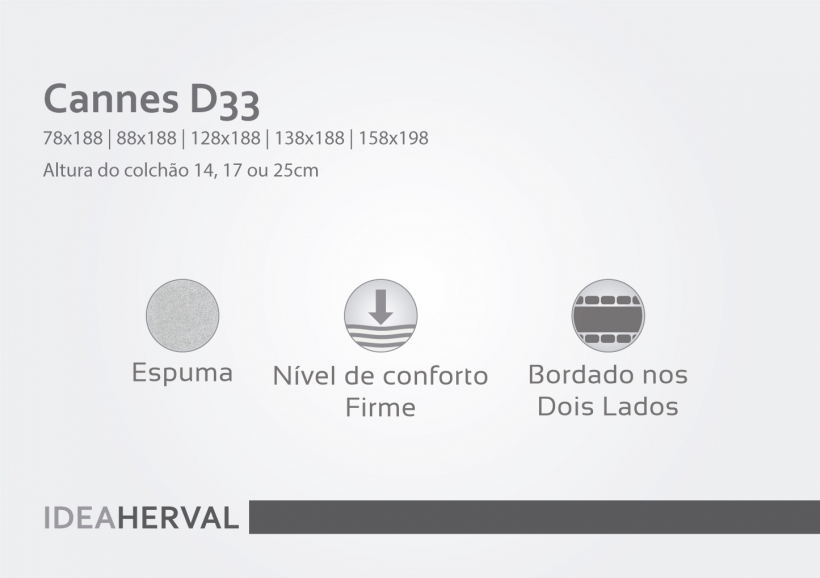O colchão Cannes D33 foi desenvolvido para você que busca um conforto mais uniforme em seu colchão Herval. Mas não abre mão do toque suave e durabilidade de um colchão construído integralmente em espuma de poliuretano.