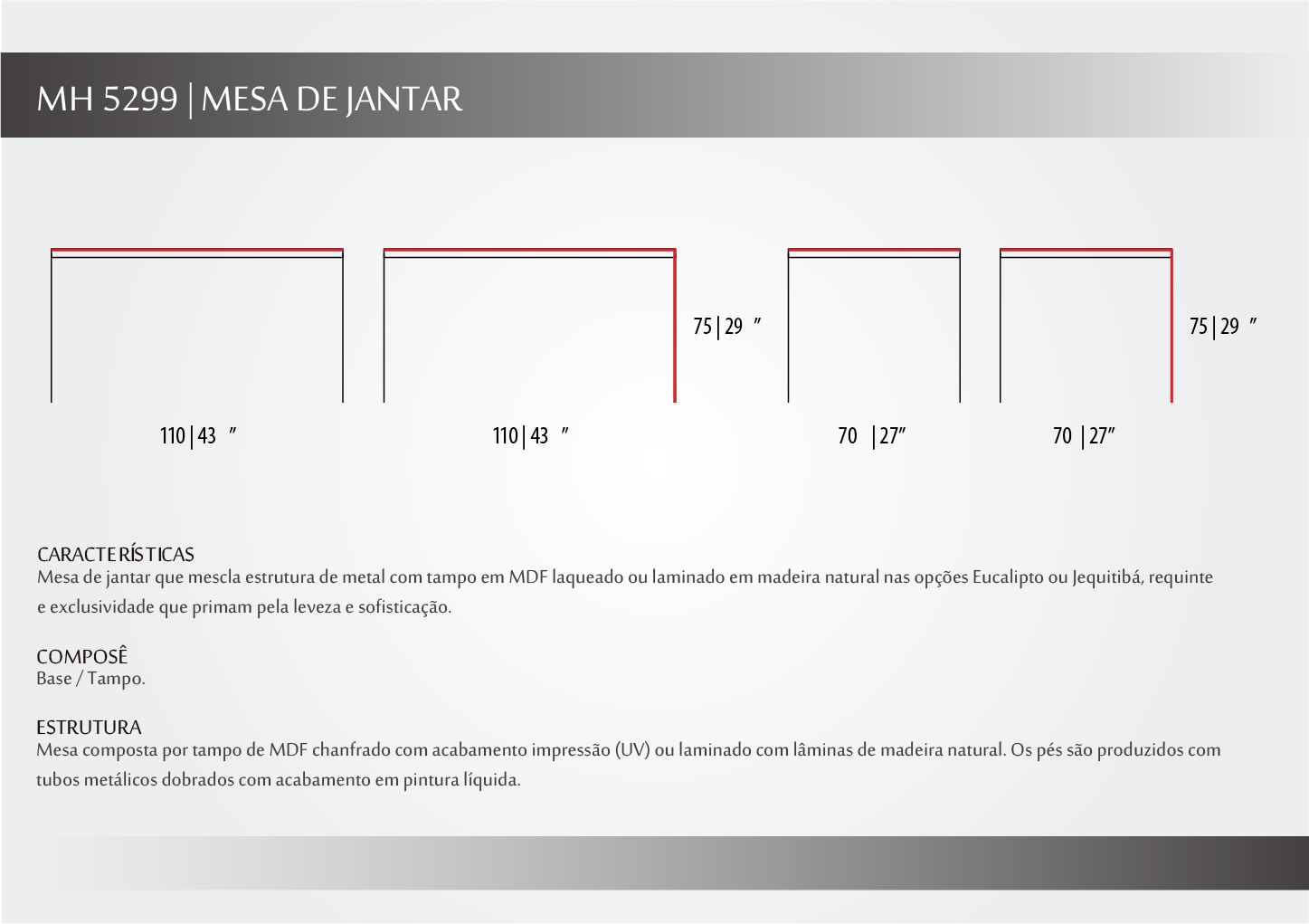 A mesa de jantar MH 5299 possui design único e contemporâneo, a base metálica junta-se ao tampo de MDF de alta qualidade revestido com lâmina de madeira natural ou com vidro pintado colado. Versátil e compacta, ela vai trazer todo o charme e praticidade que sua sala de jantar merece. Sem dúvida uma aquisição imperdível.