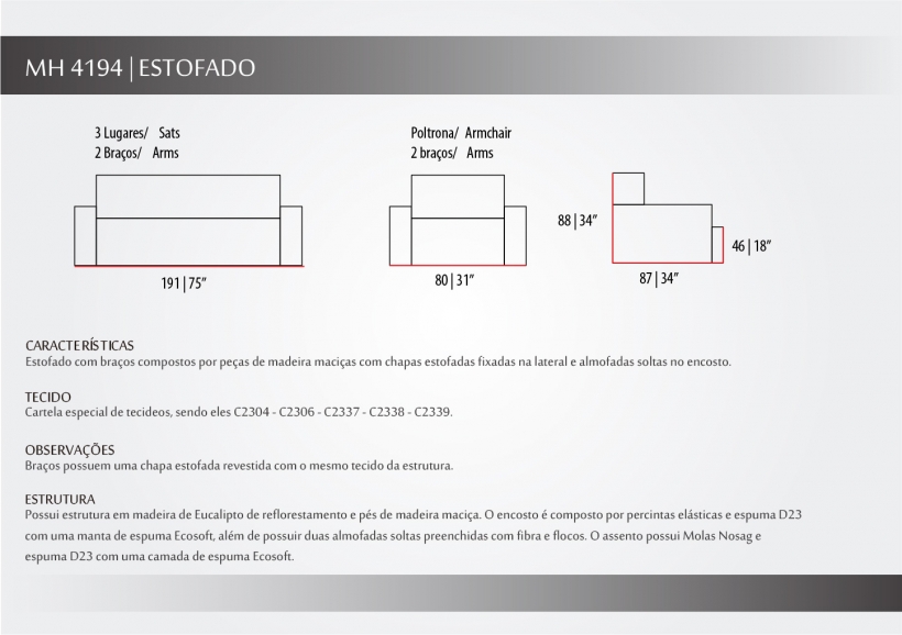 Braços e pés de madeira maciça podendo ser produzidos com os acabamentos 079EC e 147EC. Braços possuem uma chapa estofada revestida com o mesmo tecido da estrutura.
