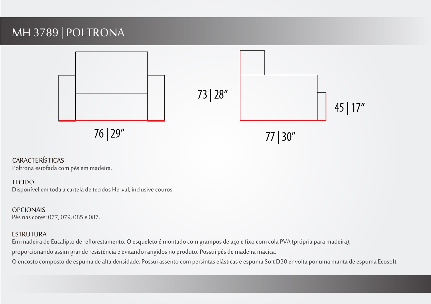 Poltrona de aproximação com estrutura de madeira maciça de reflorestamento, com assento e encosto estofado. Esta poltrona possui traços simples e suaves, a elaboração e sofisticação da peça ficam por conta do emprego de materiais, como os pés de madeira, que trazem personalidade e charme a poltrona.