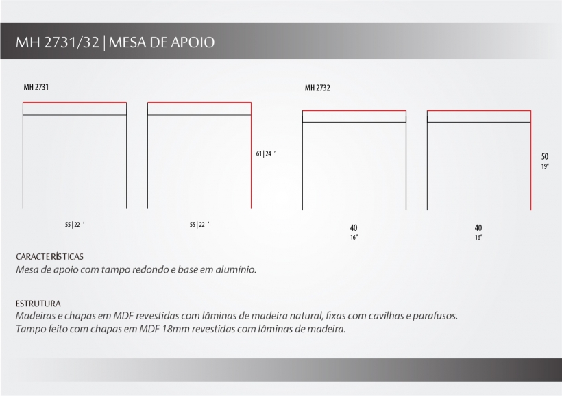 Com estrutura leve e visual contemporâneo, as mesas de apoio MH 2731 e MH 2732 são peças chave na decoração de salas, quartos e home cinema. Perfeitas em qualquer ambiente, a base de alumínio e o tampo de MDF combinados tornam o design desta peça ideal para todos os tipos de ambientes e decoração. Versáteis, elas são ideais para apoiar revistas, vasos, arranjos e objetos decorativos.