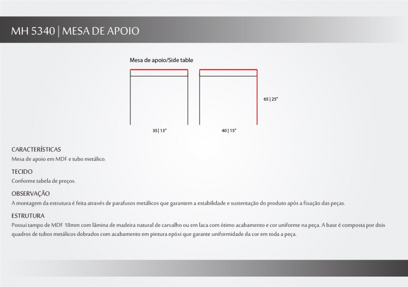 Mesa laral de apoio com base tubo metálico e tampo de MDF de alta qualidade com lâmina natural de madeira ou acabamento em pintura UV. As formas puras e suas desta mesa de apoio fazem com que ela se adapte perfeitamente a qualquer ambiente.