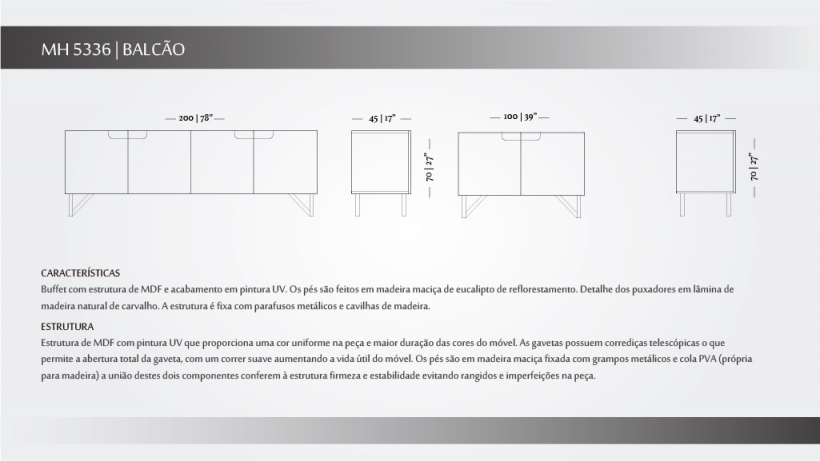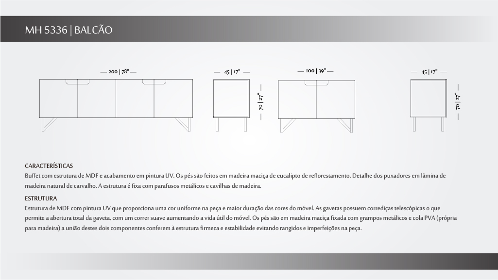 Buffet com estrutura de MDF e acabamento em pintura UV. Os pés são feitos de de madeira maciça de eucalipto de reflorestamento. Detalhe dos puxadores em lâmina de madeira natural de carvalho. A estrutura é fixa com parafusos metálicos e cavilhas de madeira. Os pés de madeira e o detalhe em lâmina dos puxadores dão charme e personalidade a este buffet, tanto na versão de 4 portas quanto na versão de portas.