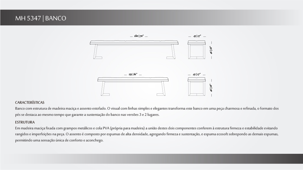 Banco com estrutura de madeira maciça e assento estofado. O visual com linhas simples e elegantes transforma este banco em uma peça charmosa e refinada, o formato dos pés se destaca ao mesmo tempo que garante a sustentação do banco nas versões 3 e 2 lugares.