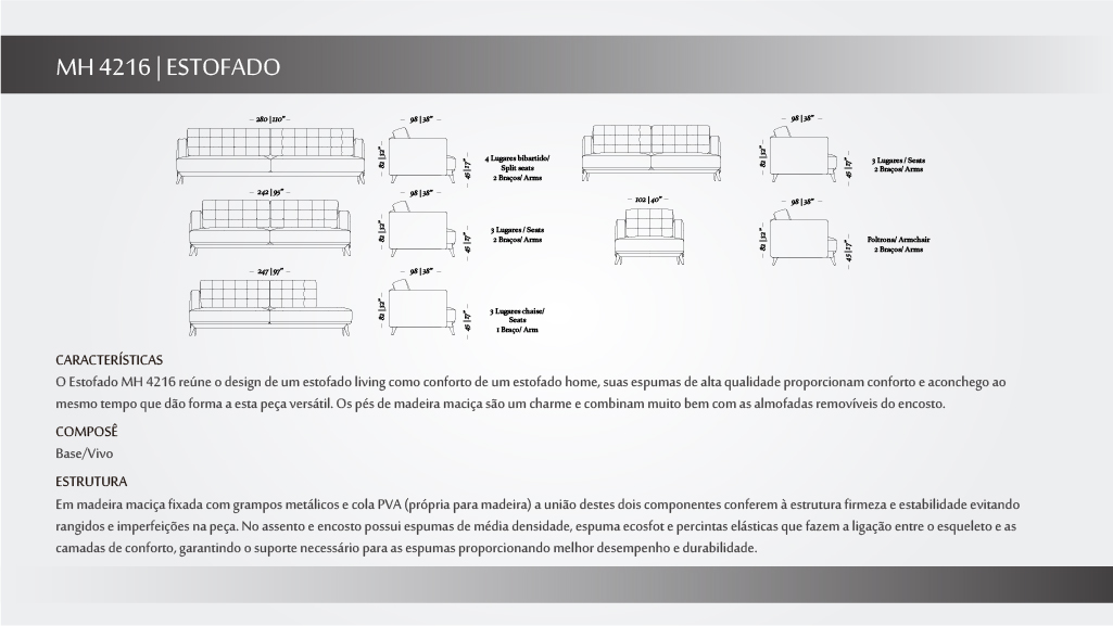 O Estofado MH 4216 reúne o design de um estofado living com o conforto de um estofado home, suas espumas de alta qualidade proporcionam conforto e aconchego ao mesmo tempo que dão forma a esta peça versátil. Os pés de madeira maciça são um charme e combinam muito bem com as almofadas removíveis do encosto.
