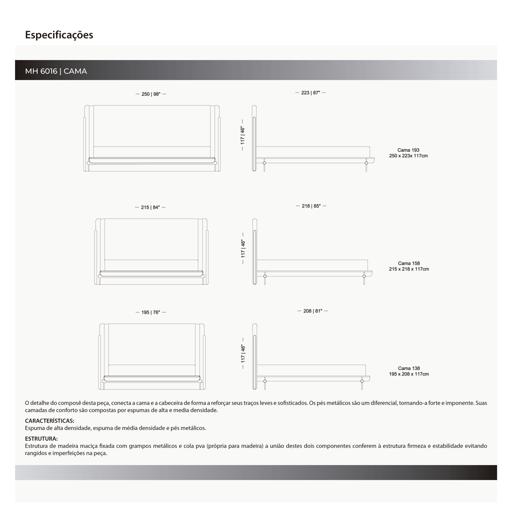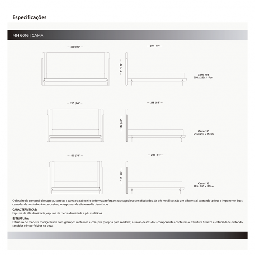 O detalhe do composê desta peça, conecta a cama e a cabeceira de forma a reforçar seus traços leves e sofisticados. Os pés metálicos são um diferencial, tornando-a forte e imponente. Suas camadas de conforto são compostas por espumas de alta e media densidade.